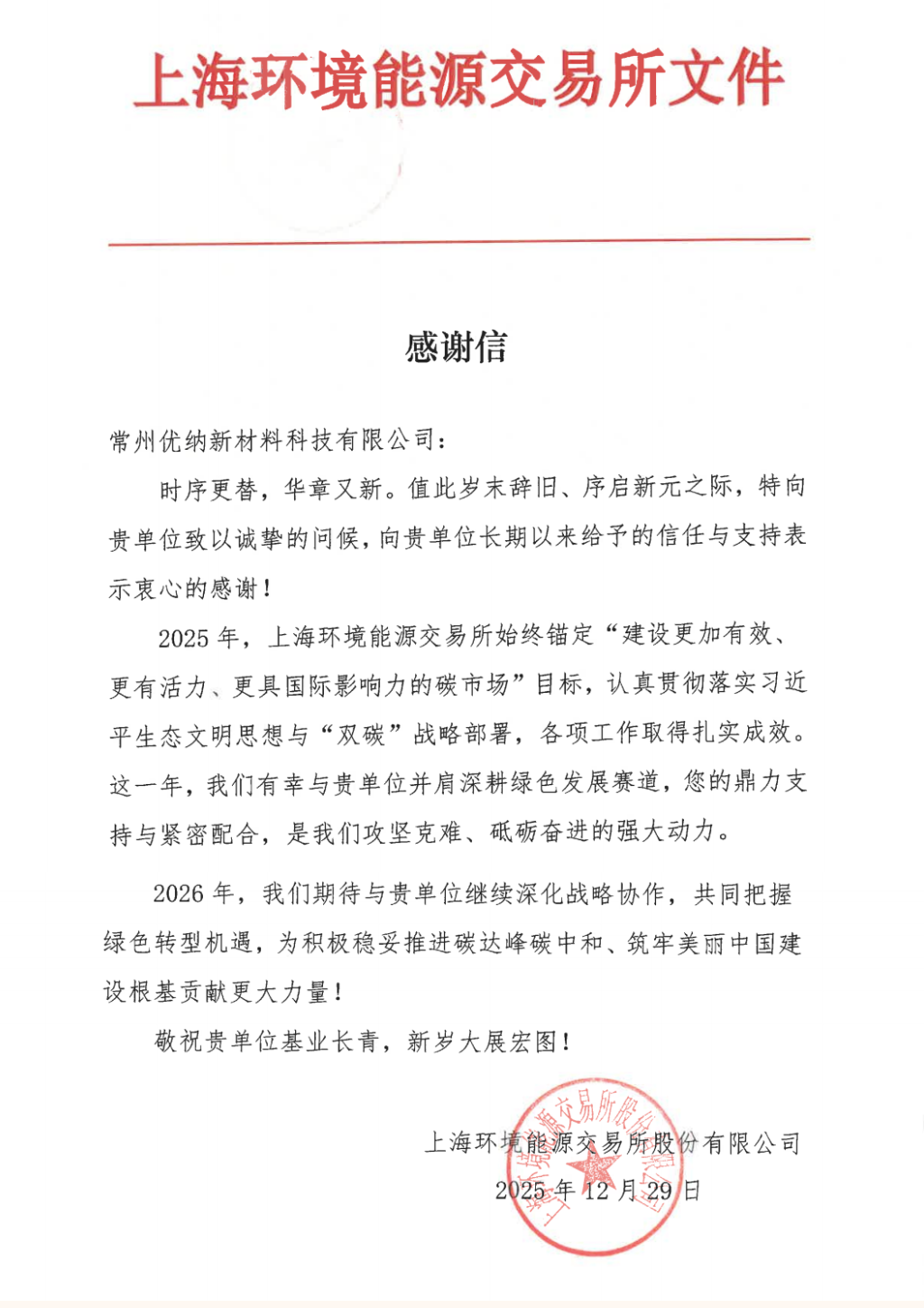 近日,优纳新材收到一封来自上海环境能源交易所的感谢信。信中环交所对优纳新材长期以来的信任与支持致以由衷谢意,高度肯定了双方在绿色发展赛道的并肩深耕成果,并表达了2026年深化战略协作、共推碳达峰碳中和目标落地的殷切期许。